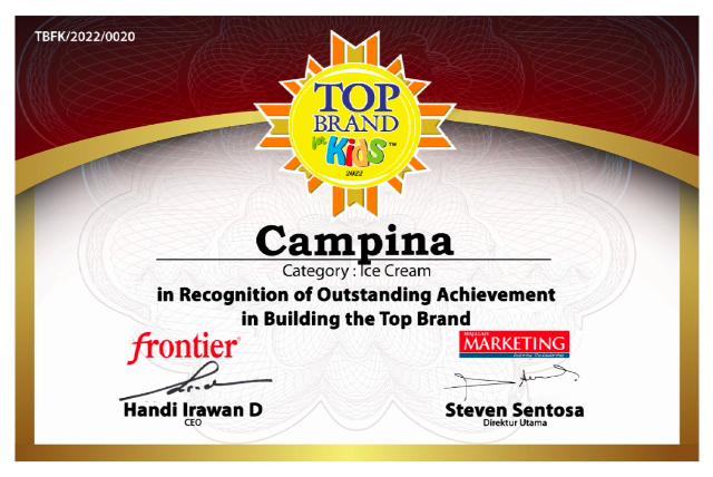 Setelah berhasil meluncurkan serangkaian varian es krim baru di perempat tahun kedua, Campina pun kembali mendapatkan Top Brand for Kids Awards 2022, untuk kategori Es Krim. Ini menandakan, legacy brand ini masih diingat dengan baik, bahkan masih menjadi salah satu merek es krim yang pertama muncul di benak responden.