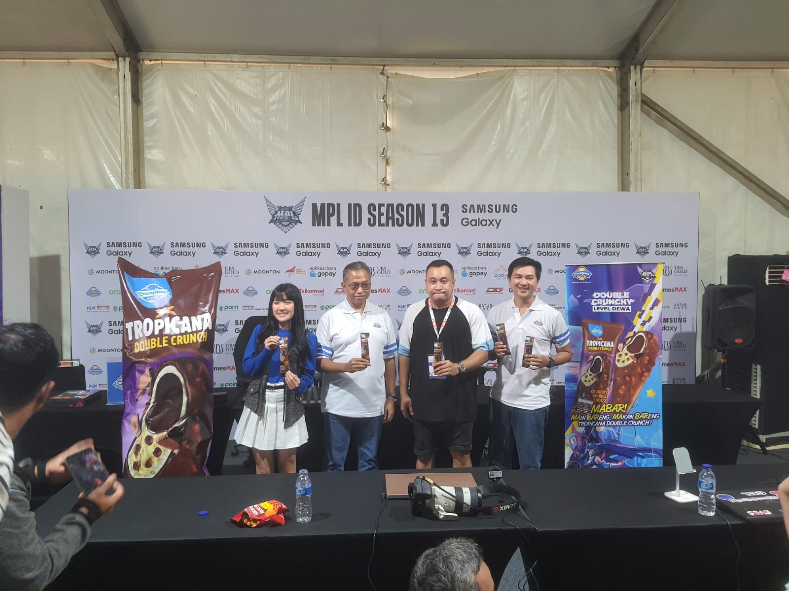 Press Conference Tropicana Double Crunch Launch di MPL Indonesia Season 13 (ki-ka) Cindy Gulla, Adji Andjono, Azwin Nugraha.