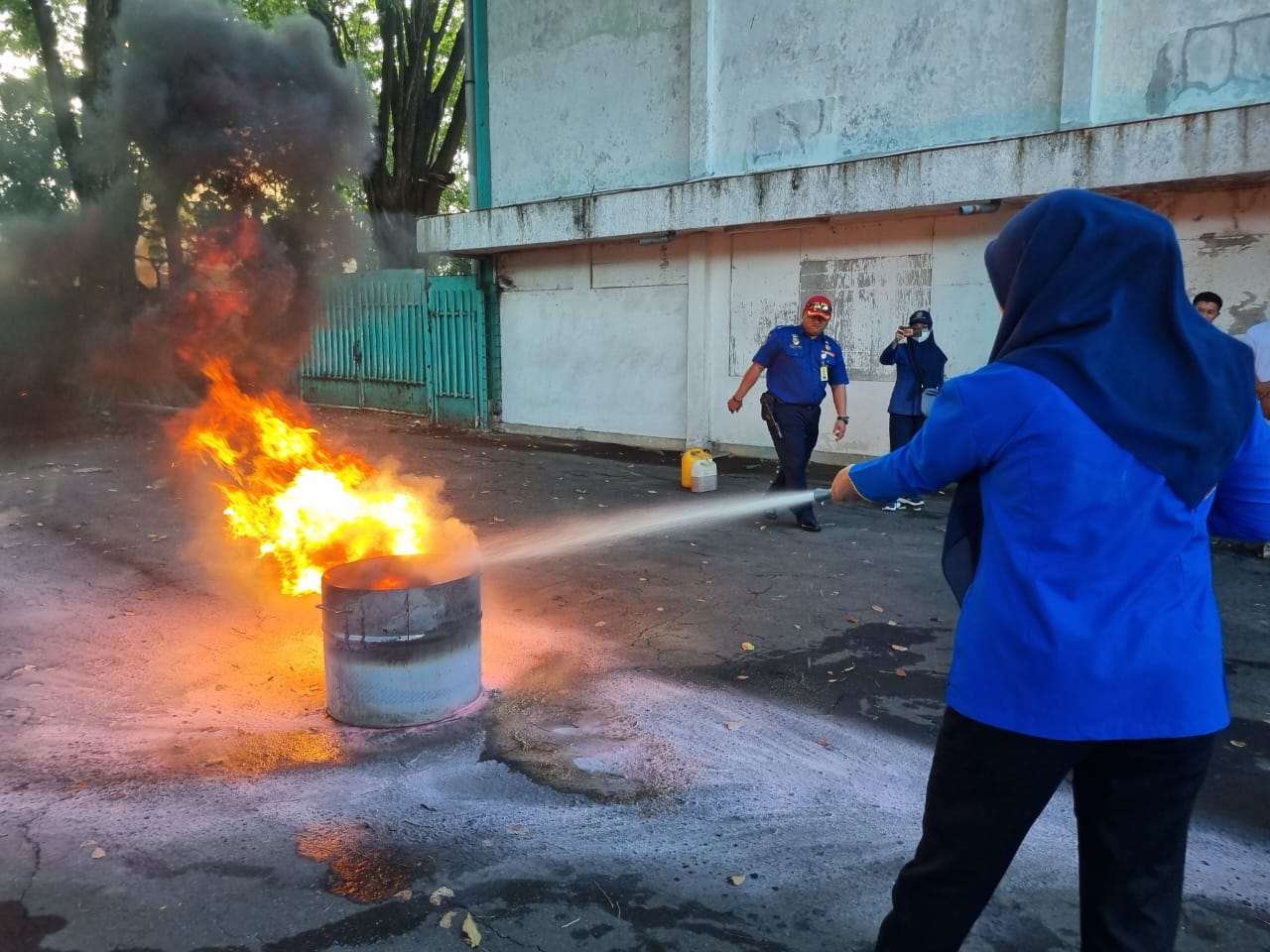 Setelah simulasi evakuasi selesai, kegiatan dilanjutkan dengan praktik penggunaan APAR bersama Petugas Pemadam Kebakaran (PMK) Surabaya. Peserta mendapatkan penjelasan singkat mengenai teori api dan teknik pemadaman, kemudian mempraktikkan langsung pemadaman api buatan menggunakan karung goni dan APAR. Kegiatan diakhiri dengan evaluasi bersama antara PMK Surabaya dan perwakilan PT Campina Ice Cream Industry, Tbk.